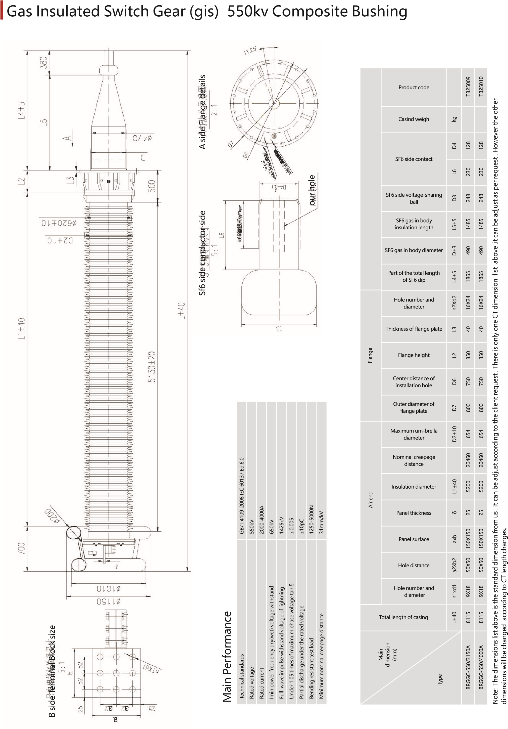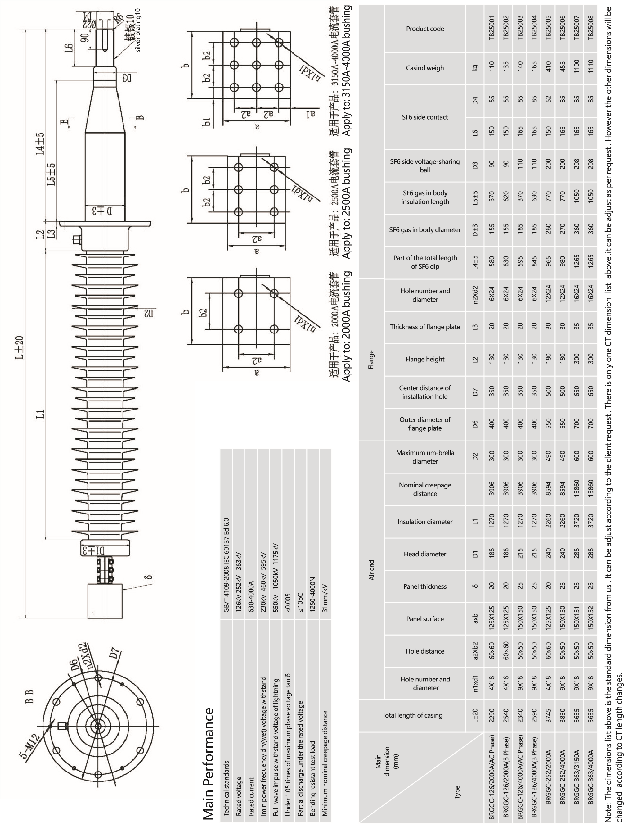 GIS bushing is mainly used in GIS substation, capacitive voltage equalizing structure, glass fiber impregnated epoxy resin reinforced winding solid insulation, and the outdoor part of the bushing is free of SF6 gas, so there is no risk of gas leakage. No inspection and maintenance are required during operation, and the operation will not lead to insulation failure due to temperature change and pressure change, especially suitable for low temperature environment.